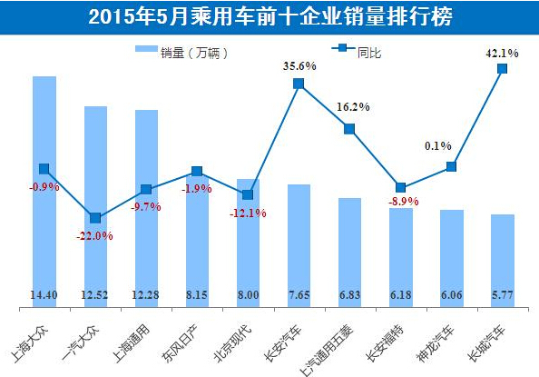 2015年5月乘用車(chē)前十企業(yè)銷(xiāo)量分析:過(guò)半銷(xiāo)量下跌作者:網(wǎng)站管理員 來(lái)源:中國(guó)汽車(chē)零部件 時(shí)間:2015/6/9 7:51:42 根據(jù)蓋世汽車(chē)網(wǎng)整理的數(shù)據(jù),今年5月份,乘用車(chē)市場(chǎng)(指狹義乘用車(chē)市場(chǎng),不包括微客)銷(xiāo)量前十企業(yè)依次是上海大眾、一汽大眾、上海通用、東風(fēng)日產(chǎn)、北京現(xiàn)代、長(zhǎng)安汽車(chē)、上汽通用五菱、長(zhǎng)安福特、長(zhǎng)安福特、神龍汽車(chē)和長(zhǎng)城汽車(chē)。
