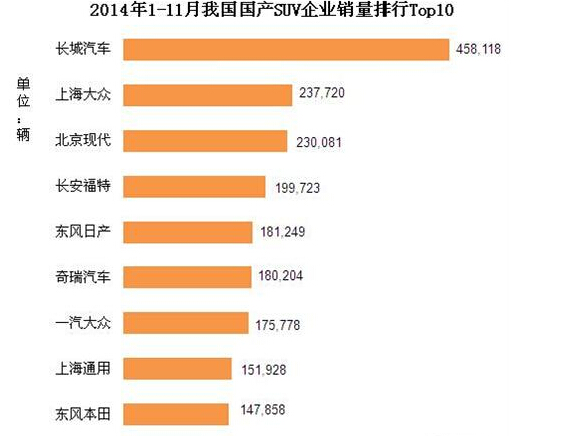 2014年1-11月份國(guó)產(chǎn)SUV企業(yè)銷量排行Top10