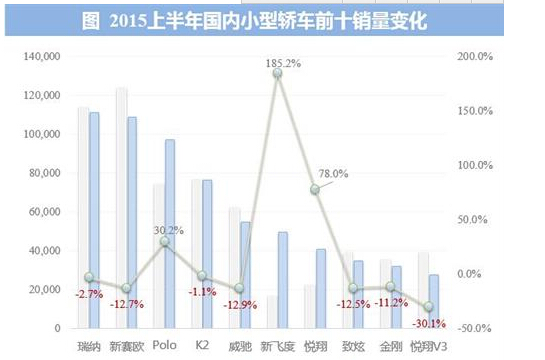 2015年上半年小型車市場前十暢銷車分別是瑞納、新賽歐、Polo、起亞K2、威馳、新飛度、悅翔、致炫、致炫、金剛和悅翔V3,其中過半(六款)銷量呈下跌態(tài)勢。