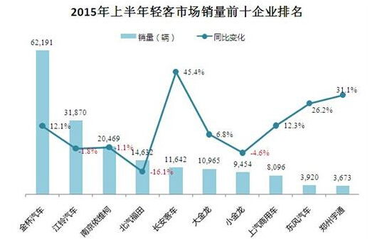 其中,長安客車增幅最為明顯,今年上半年累計銷售11,642輛,較2014年同期增長45.4%。處于領跑地位的金杯汽車,上半年銷售輕客62,191輛,同比增長12.1%。鄭州宇通6月銷量暴增139.8%,上半年累計銷售3,673輛,同比增長31.1%。