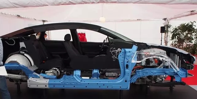FCV采用的底盤 燃料電池堆與2008年開始租售的FCV“FCX Clarity”相比,電流密度提高了50%,從而將層疊的電池單元數(shù)量削減了30%。另外,通過將每個電池單元之間的間隔減至1mm,將層疊尺寸削減了20%。由此實現(xiàn)了燃料電池堆的小型化。燃料電池堆的輸出密度為3.1kW/L,達到全球最高等級。