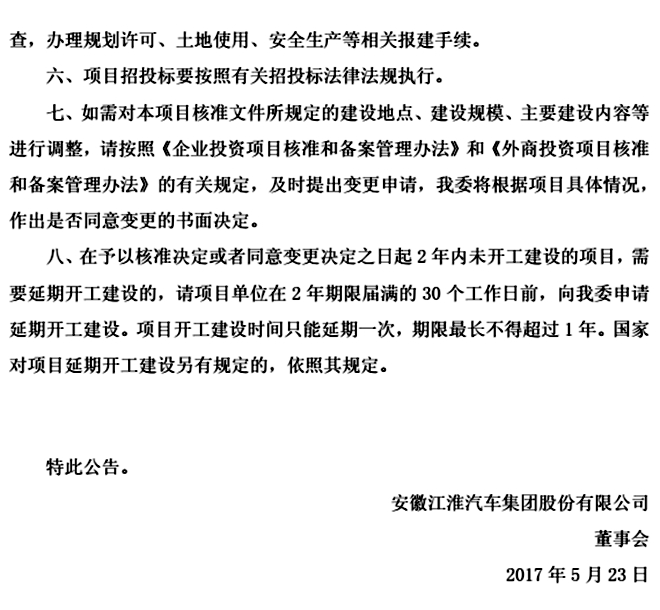 江淮汽車發(fā)布公告:與大眾汽車合資生產純電動乘用車項目獲發(fā)改委批準作者: 來源:安徽江淮汽車股份有限公司 時間:2017/5/24 9:45:29