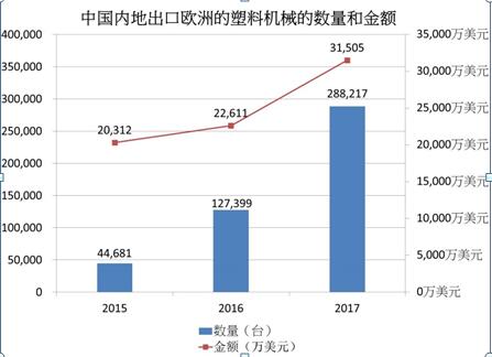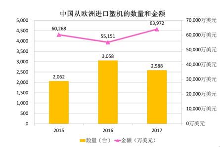 中國從歐洲進口塑機的數(shù)量和金額也呈現(xiàn)了增長的趨勢。2015年中國從歐洲進口的塑機數(shù)量為2,062臺,金額為60,268萬美元;2016及2017年塑機的進口量分別為3,058臺及2,588臺,金額則分別為55,151萬美元及63,972萬美元。其中,中國內(nèi)地從意大利進口的塑料機械的數(shù)量和金額也呈增長趨勢,即從2015年233臺,7,352萬美元增長到2017年的331臺,7,918萬美元。由此可見中國與意大利和歐洲的經(jīng)貿(mào)合作不斷加深。