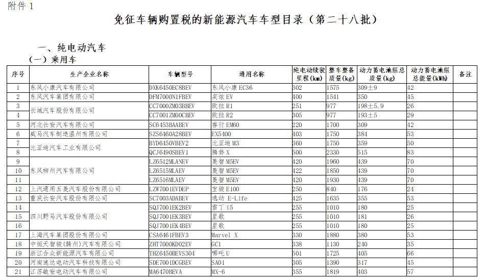 1.免征車輛購置稅的新能源汽車車型目錄(第二十八批)