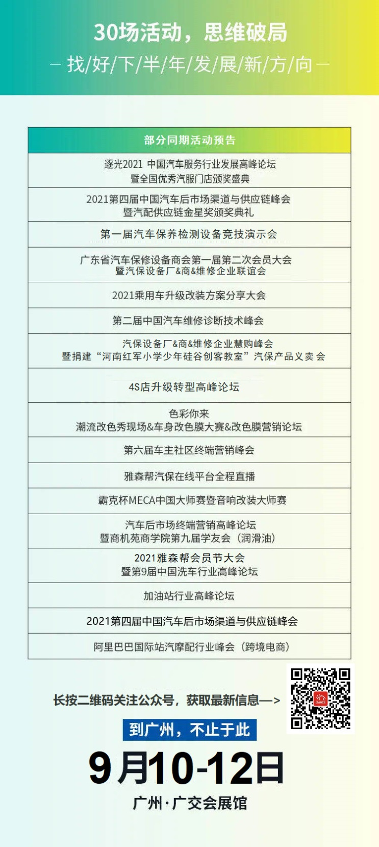 汽保設備部分參展企業(yè) 30+場同期活動,助力思維破局解鎖未來 本屆展會聚焦行業(yè)前沿,精心策劃30+場同期活動,包括逐光2021中國汽車服務行業(yè)發(fā)展高峰論壇暨全國優(yōu)秀汽服門店頒獎盛典、第二屆中國汽車維修診斷技術峰會、4S轉(zhuǎn)型升級高峰論壇、阿里巴巴國際站汽摩配行業(yè)峰會、汽保制造商/經(jīng)銷商惠購高峰論壇、2021第四屆中國汽車后市場渠道與供應鏈峰會暨汽配供應鏈金星獎頒獎典禮等,重量級行業(yè)大咖聯(lián)袂為觀眾全面解讀未來趨勢,深入探索后市場轉(zhuǎn)型發(fā)展的新模式與新動能,勢必帶來思維碰撞智慧的火花,點燃下半年營銷新觸點!
