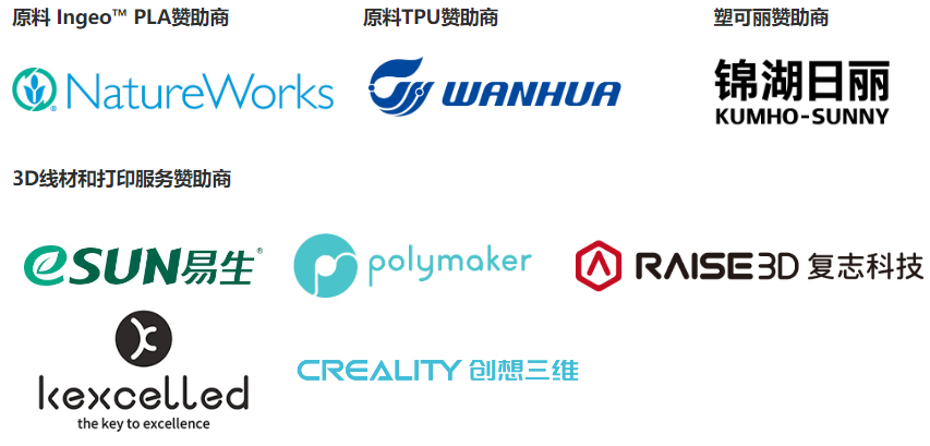 1. 我們使用的3D打印材料都是可持續(xù)材料,有NatureWorks贊助的Ingeo™ PLA材料、萬華化學(xué)贊助的生物基TPU材料,以及錦湖日麗贊助的免噴涂材料塑可麗。