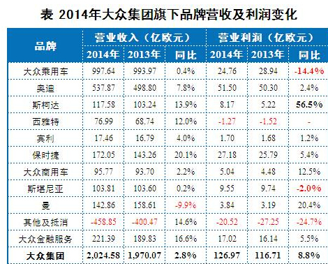 從營(yíng)收來(lái)看,大眾旗下所有乘用車品牌同比均實(shí)現(xiàn)正增長(zhǎng)。其中大眾品牌營(yíng)收依舊最高,并且扭轉(zhuǎn)了2013年的下跌局面,同比微增0.4%至997.64億歐元。其他由虧轉(zhuǎn)盈的還有斯柯達(dá)以及大眾商用車,同比分別增長(zhǎng)13.9%和2.2%至117.58億歐元和95.77億歐元。 營(yíng)收排名第二的奧迪較2013年的498.8億歐元增至2014年的537.87億歐元,同比增長(zhǎng)7.8%。第三的保時(shí)捷去年?duì)I收實(shí)現(xiàn)172.05億歐元,同比增長(zhǎng)20.1%,增長(zhǎng)最快。西雅特2014年?duì)I收達(dá)76.99億歐元,同比增長(zhǎng)12.0%。賓利2014年?duì)I收為17.46億歐元,同比微增4.0%。 營(yíng)業(yè)利潤(rùn):斯柯達(dá)暴增 西雅特持續(xù)虧損 從營(yíng)業(yè)利潤(rùn)來(lái)看,斯柯達(dá)表現(xiàn)最為搶眼。不僅扭轉(zhuǎn)了2013年的下跌態(tài)勢(shì),而且增長(zhǎng)超半,其營(yíng)業(yè)利潤(rùn)由2013年的5.22億歐元猛增至去年的8.17億歐元,同比暴增56.6%。其他增長(zhǎng)幅度達(dá)兩位數(shù)的還有大眾商用車,其去年?duì)I業(yè)利潤(rùn)實(shí)現(xiàn)5.04億歐元,同比增長(zhǎng)12.5%。奧迪去年?duì)I業(yè)利潤(rùn)較2013年的50.30億歐元增至51.50億歐元,繼續(xù)蟬聯(lián)利潤(rùn)榜單首位,同比微增2.4%,且扭轉(zhuǎn)了2013 的下跌局面。 大眾品牌持續(xù)兩位數(shù)下跌。2014年大眾品牌營(yíng)業(yè)利潤(rùn)實(shí)現(xiàn)24.76億歐元,同比下跌14.4.%。賓利、保時(shí)捷增速均放緩,2014年賓利營(yíng)業(yè)利潤(rùn)實(shí)現(xiàn)1.70億歐元,同比增長(zhǎng)1.2%,增速較2013年的68.0%有所放緩。保時(shí)捷去年?duì)I業(yè)利潤(rùn)實(shí)現(xiàn)27.18億歐元,同比增長(zhǎng)幅度較2013年的173.5%縮至去年的5.4%。 西雅特仍然處于虧損狀態(tài),并且虧損幅度持續(xù)收窄。其去年?duì)I業(yè)利潤(rùn)虧損1.27億歐元,較2013年的1.52億歐元再度減少。