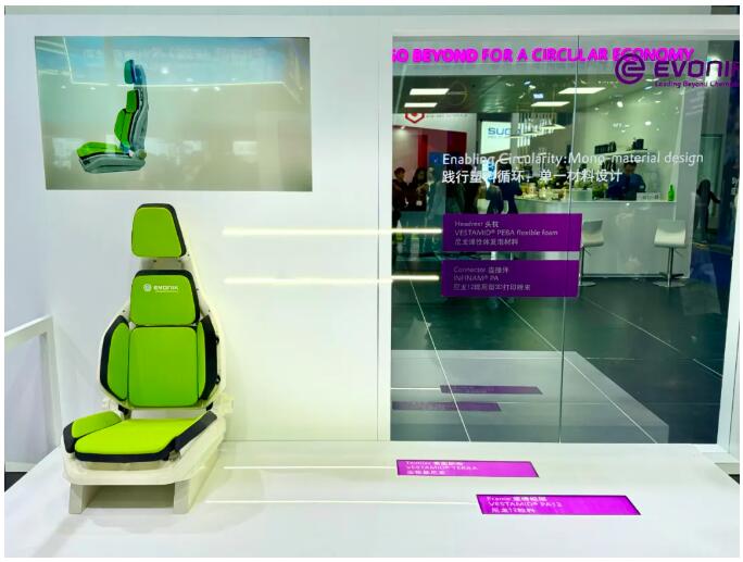▲贏創(chuàng)帶來一款與合作伙伴聯(lián)合開發(fā)的、完全由PA12塑料制成的概念汽車座椅。由于該座椅均由同一種材料制成,不僅可以在生產(chǎn)中盡可能減少材料的消耗,在設(shè)計上也可以實現(xiàn)全部材料的回收再利用。
