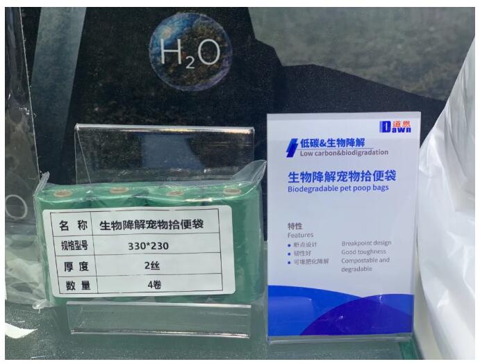 ▲道恩展出生物降解寵物拾便袋,具有斷點(diǎn)設(shè)計、韌性好、可堆肥化降解等特性。