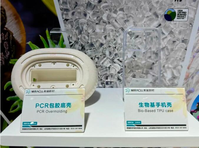 ▲美瑞新材展出了PCR包膠底殼及生物基手機(jī)殼。